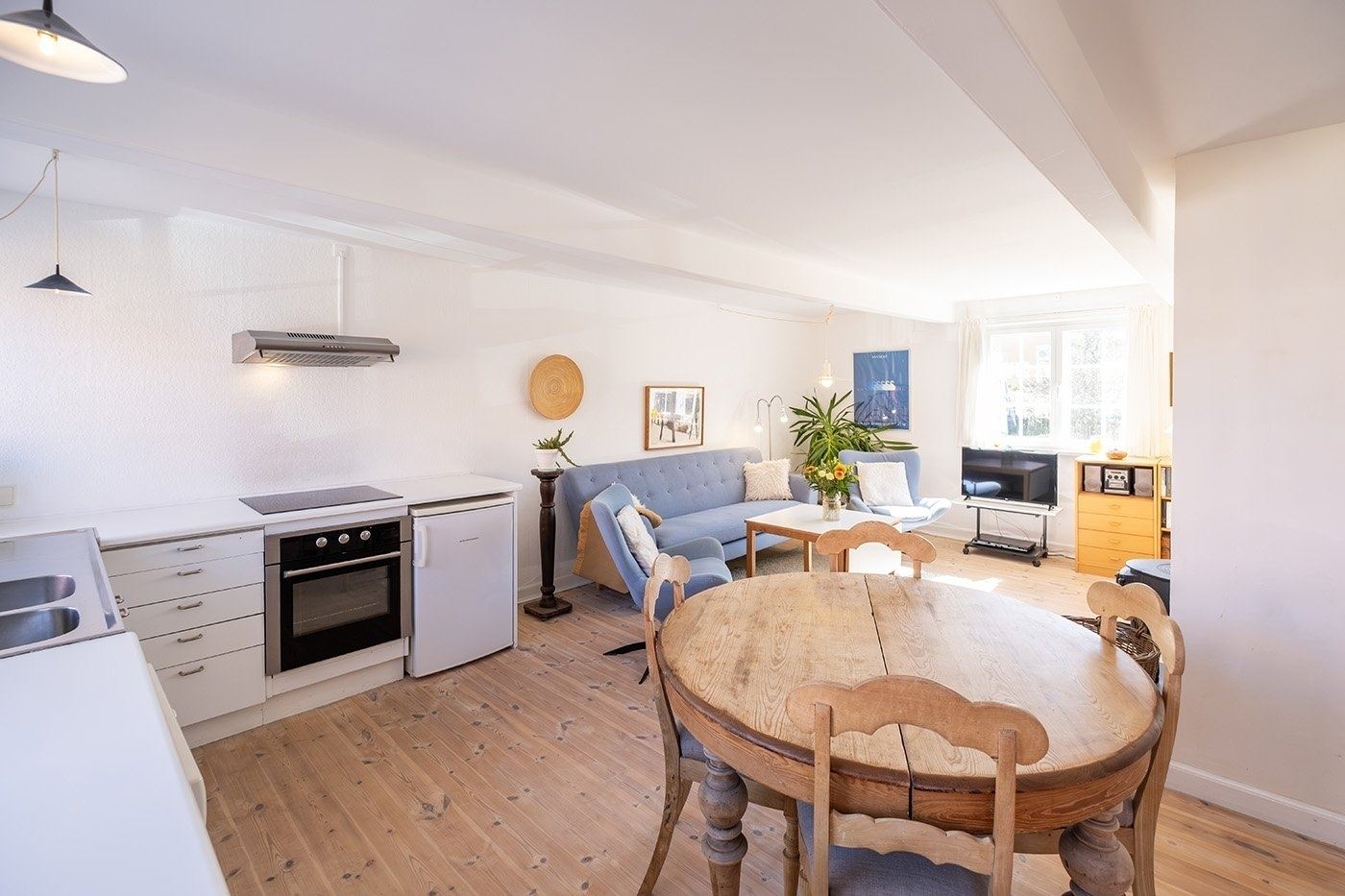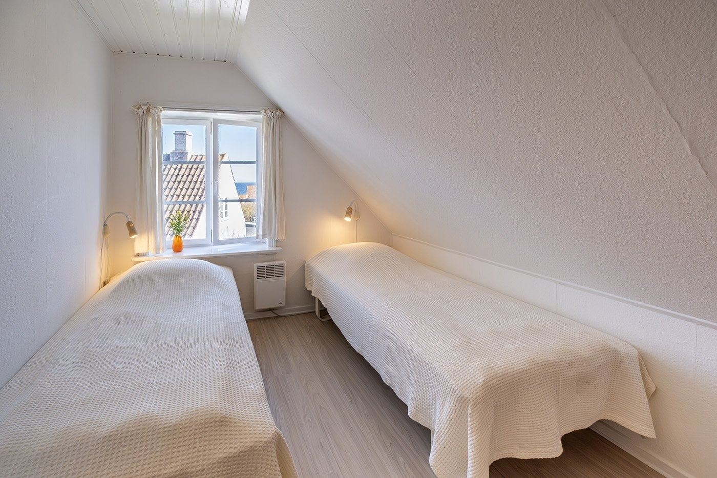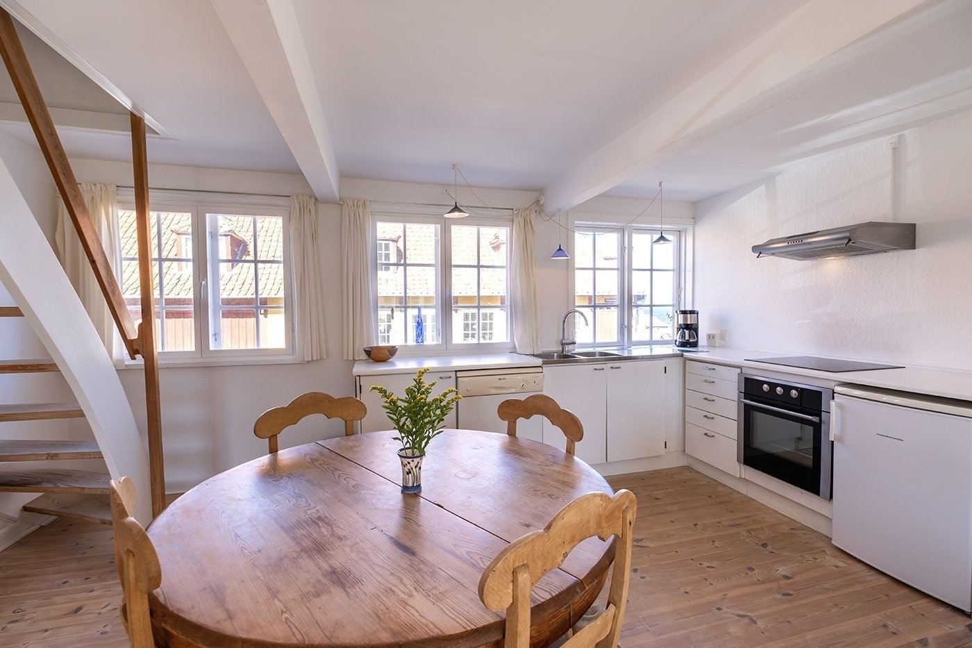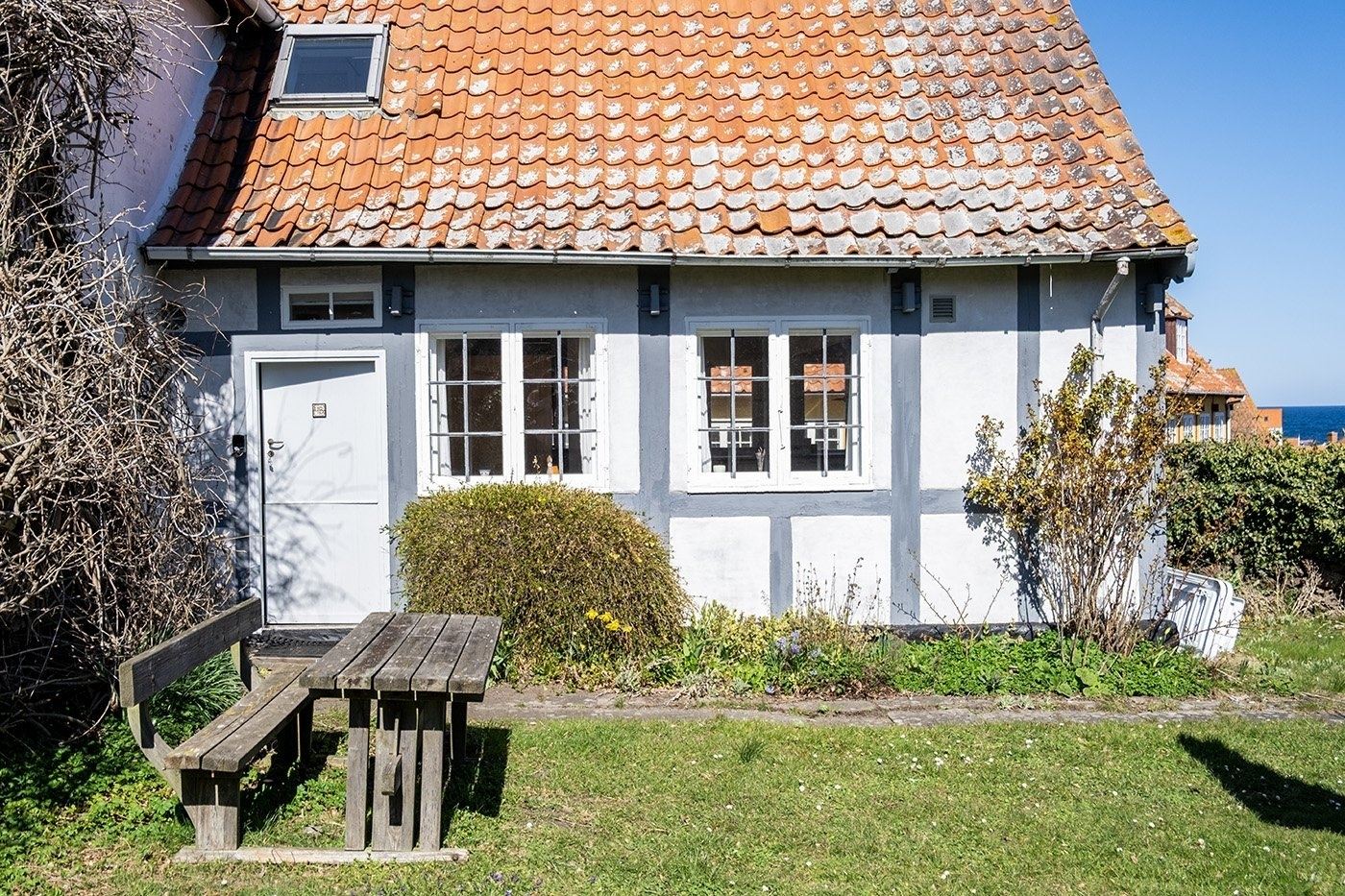 Look forward to a relaxing holiday in this charming apartment set in a characterful half-timbered house in the heart of Svaneke’s winding streets. Here, you stay peacefully and set back despite the central location, within walking distance of the harbour and the square with shops, restaurants and unique boutiques. You have the very best of Svaneke right on your doorstep, while still being able to retreat and enjoy the tranquillity. The apartment is spread over two floors and is arranged as follows: The ground floor offers an entrance with access to the living area as well as a bathroom with shower, toilet and washbasin. The living area is furnished with a wood-burning stove, TV with Chromecast, sofa and armchairs, as well as a dining area. The kitchen is open-plan with the living area and is well equipped with, among other things, a dishwasher, coffee machine and electric kettle. From the kitchen, you have a lovely partial sea view, so you can enjoy the view while preparing meals. A staircase from the living area leads to the first floor with two spacious bedrooms, both furnished with two single beds that can be pushed together. The rooms offer good wardrobe space, and one of the bedrooms also has a nice partial sea view. The apartment also features a pleasant enclosed garden shared with another holiday apartment. You have your own section with garden furniture and a barbecue, where you can enjoy sunny days and meals outdoors.