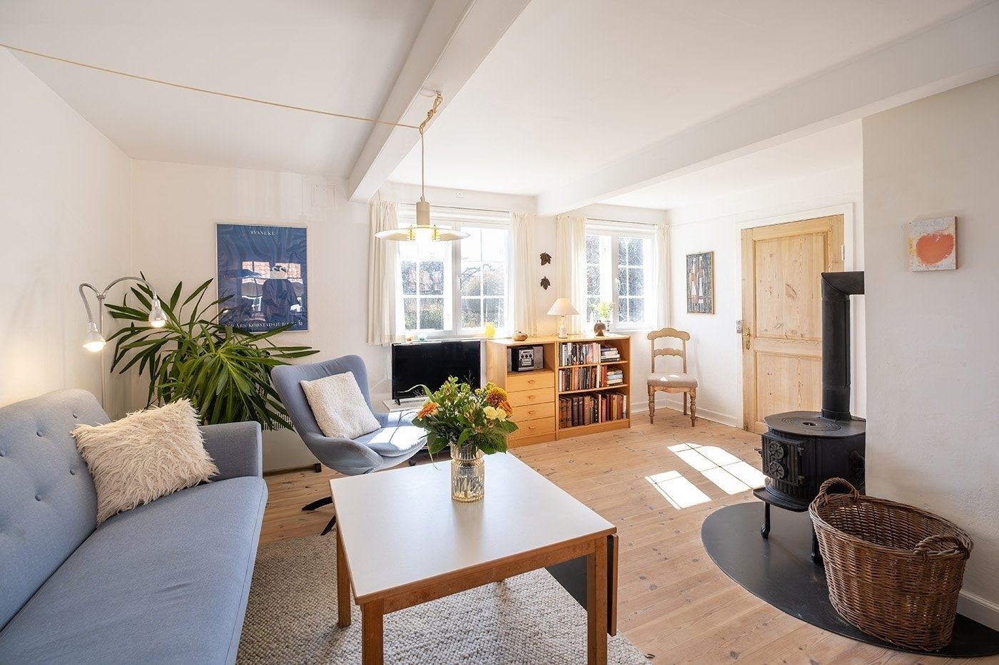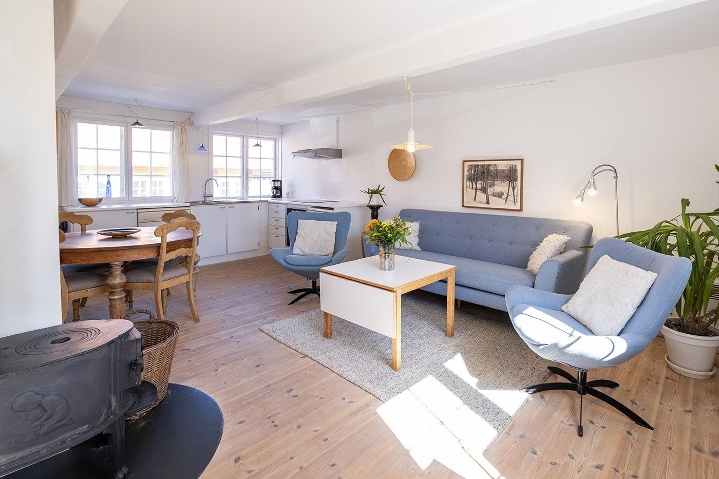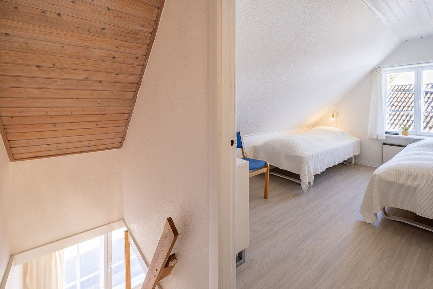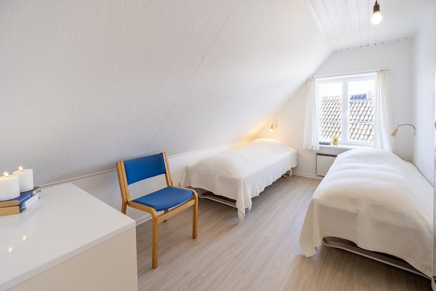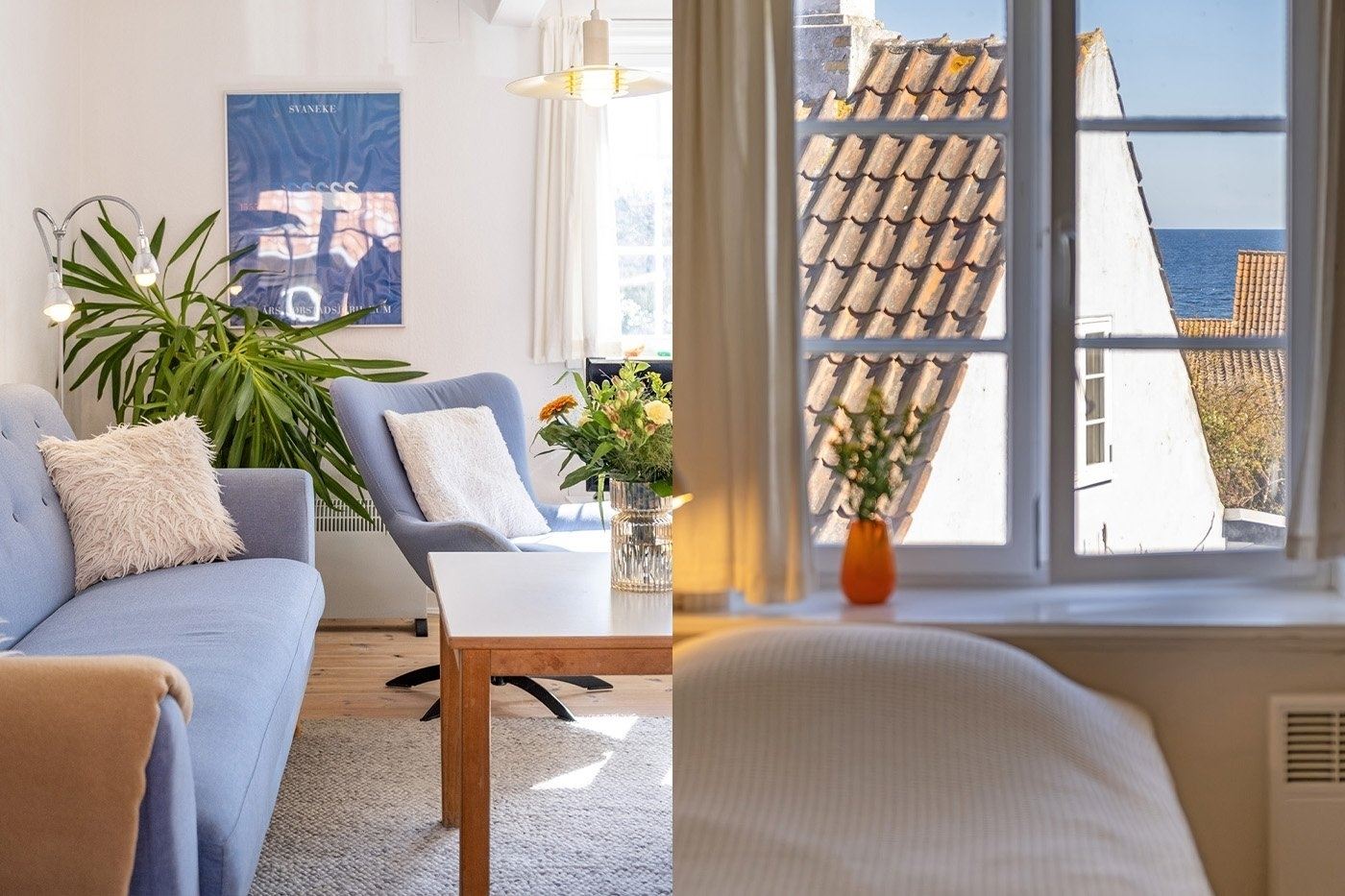 Look forward to a relaxing holiday in this charming apartment set in a characterful half-timbered house in the heart of Svaneke’s winding streets. Here, you stay peacefully and set back despite the central location, within walking distance of the harbour and the square with shops, restaurants and unique boutiques. You have the very best of Svaneke right on your doorstep, while still being able to retreat and enjoy the tranquillity. The apartment is spread over two floors and is arranged as follows: The ground floor offers an entrance with access to the living area as well as a bathroom with shower, toilet and washbasin. The living area is furnished with a wood-burning stove, TV with Chromecast, sofa and armchairs, as well as a dining area. The kitchen is open-plan with the living area and is well equipped with, among other things, a dishwasher, coffee machine and electric kettle. From the kitchen, you have a lovely partial sea view, so you can enjoy the view while preparing meals. A staircase from the living area leads to the first floor with two spacious bedrooms, both furnished with two single beds that can be pushed together. The rooms offer good wardrobe space, and one of the bedrooms also has a nice partial sea view. The apartment also features a pleasant enclosed garden shared with another holiday apartment. You have your own section with garden furniture and a barbecue, where you can enjoy sunny days and meals outdoors.
